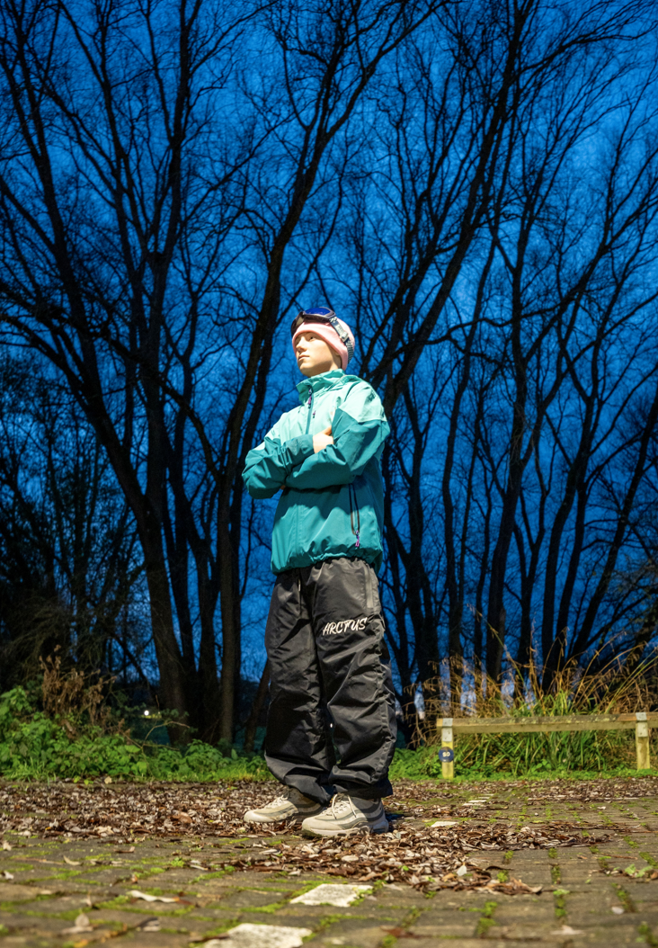 BAGGY, WATERPROOF, INSULATED, ZIP POCKETS, DRAWSTRINGS, CUFFED BOTTOMS.